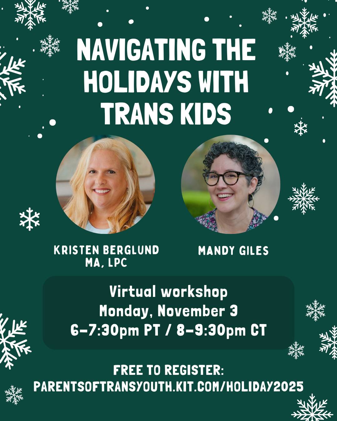 The holiday season is almost here! Lots of joy, lots of family, and lots of … challenges. How do you navigate this time of year with a transgender child? Join me and therapist Kristen Berglund, MA, LPC (she/her) of B Well Counseling Center and KB Wellness for our FREE online workshop “Navigating the Holidays with Trans Kids” on Monday, November 3, at 6 PM PT/8 PM CT. In this lively session, we’ll discuss how families of transgender, nonbinary, and gender-diverse kids can navigate the holiday...