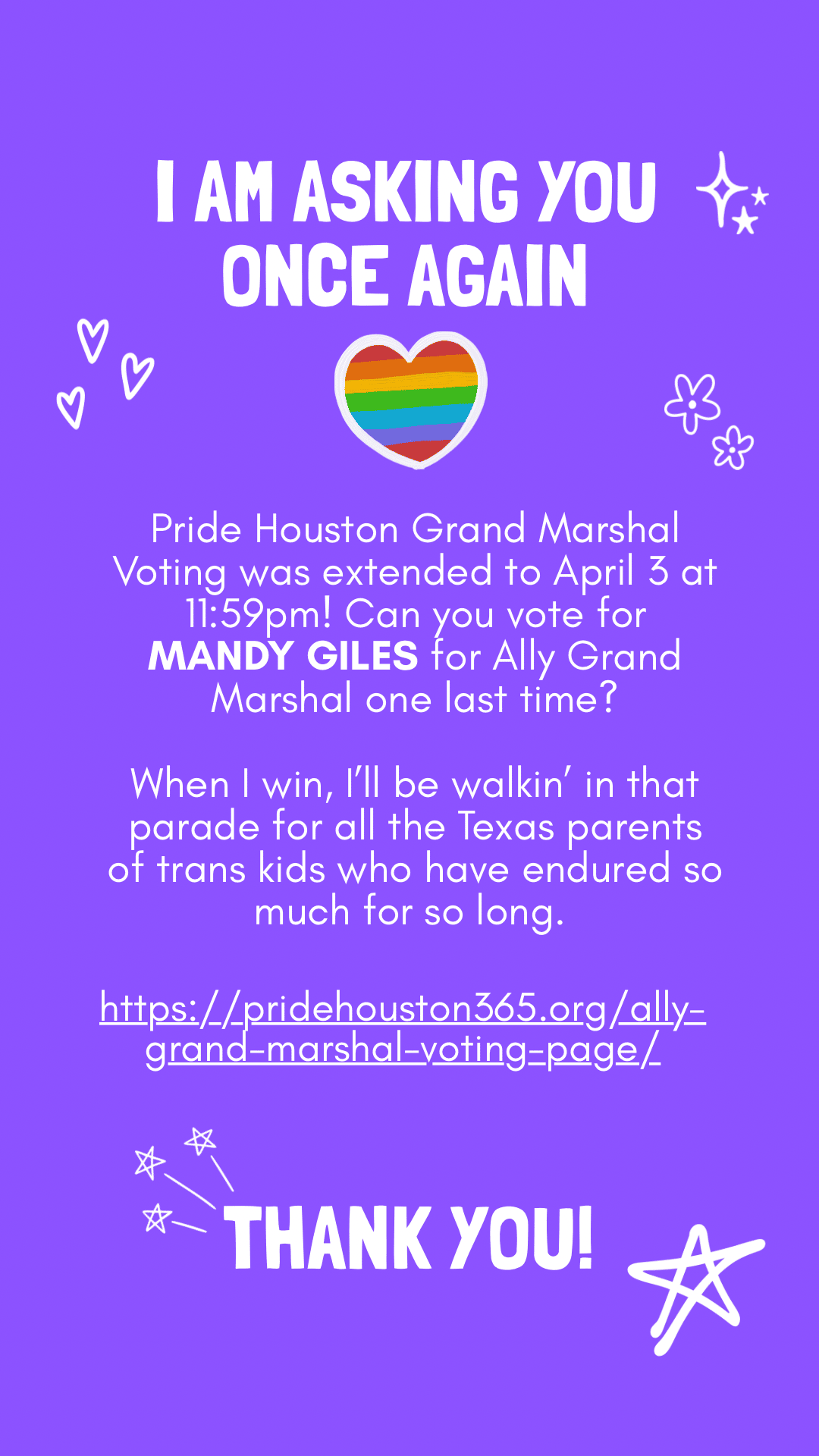 I’m nominated for Pride Houston Ally Grand Marshal, and I'm really excited and honored! Voting was supposed to end yesterday, but it was extended to April 3 at 11:59pm tonight! Can you vote for me for Ally Grand Marshal one last time? Anyone, anywhere can vote. Just click a button - you don't have to give any info. When I win, I’ll be walkin' in that parade for all the Texas parents of trans kids who have endured so much for so long. Please share, and THANK YOU! Please vote for me! Mandy...